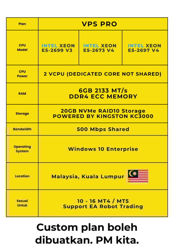 Berbeza dengan kebanyakan provider VPS yang terlebih jual (oversell) dan mengenakan “polisi penggunaan saksama,” Forex VPS kami menawarkan prestasi sebenar. CPU, RAM, dan storage anda adalah 100% milik anda — tidak dikongsi dengan pengguna lain. Ini bermakna tiada kelembapan pada waktu banyak news, tiada had tersembunyi, dan prestasi yang stabil 24/7. Sesuai untuk trading yang memerlukan kelajuan dan kebolehpercayaan.